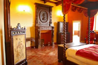 Une savante composition entre mobilier ancien et tentures baroques, dont les motifs sont repeints sur les portes et volets |