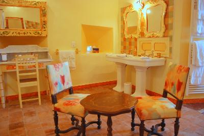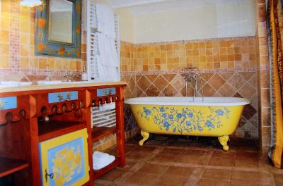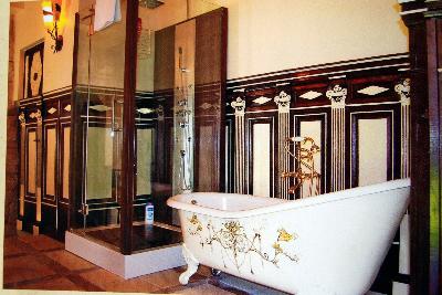 Une salle de bain a l'incroyable charme, conféré en partie parles boiseries anciennes restaurées |