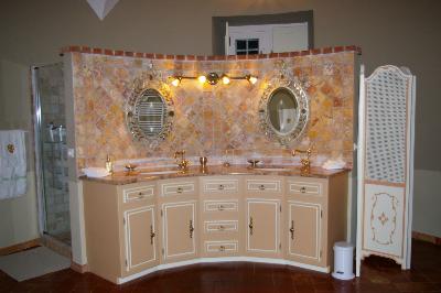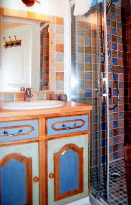 | | sobriéte, blanc et bordeau pour ce petit espacede 3MX2m | Ici, l'espace salle de bain s'aacentue autour du meuble henri 11 relooké, les carrelages décorés par B.C |