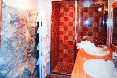 | l 'idée relooking?Parir de petit meubles basiques de la grande distribution, et miser | petites salles de bain crée pour un hotel, chaque salle de bain se differcie par le thème | ici, l'espace salle de bain a été crée autour de la roche du mur, confrontée a un marbre oranger et pastel |