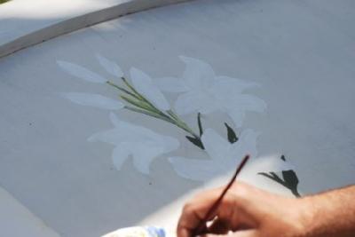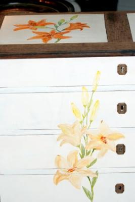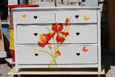 | résultat final, décor coquelicot, peinture fafrine blanche, patine cire blanche | Atelier initiation décor peint