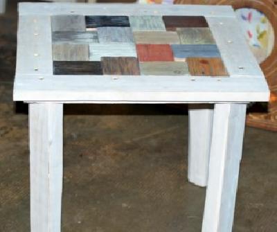 | recyclage palettes: magnifique table"mosaique" de bois et patines