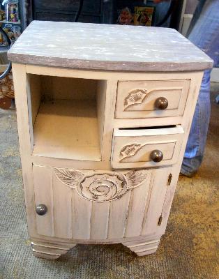 | | relooking chevet, peinture farine et cire, marbre patiné