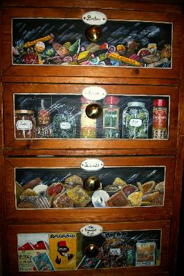 trompe l'oeil gourmand, réalisé sur c ommande | Un petit semainier "transformé"en garde manger | trompe l'oeil gourmand sur commande |