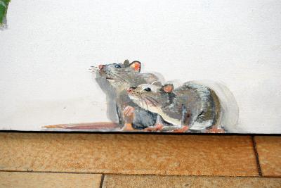 trompe l'oeil animalier Pour garder le contact avec son compagnon favori | Trés jolie création originale pour cette malle, trompe l'oeil faux bois, , famille de lapins | 2" Petits détails" , sur plinthe d"une cuisine relookée |