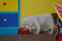 Flacons de parfums et produits de beauté en trompe l'oeil, pour ce meuble peint de salle de bain | trompe l'oeil vieux livres et cahiets pour ce vieux bureau d'écolier | Bébés bouledogues et paire de baskets en trompe l'oeil |