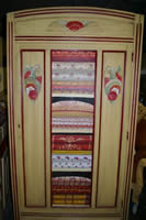 Trompe l'oeil réussi pour ce foulard provençal semble bien réel | Illusion d'une pile de linges et tissus bien rangés pour ce trompe l'oeil sur amoire peinte | Trompe l'oeil davantage technique qu' artistique |